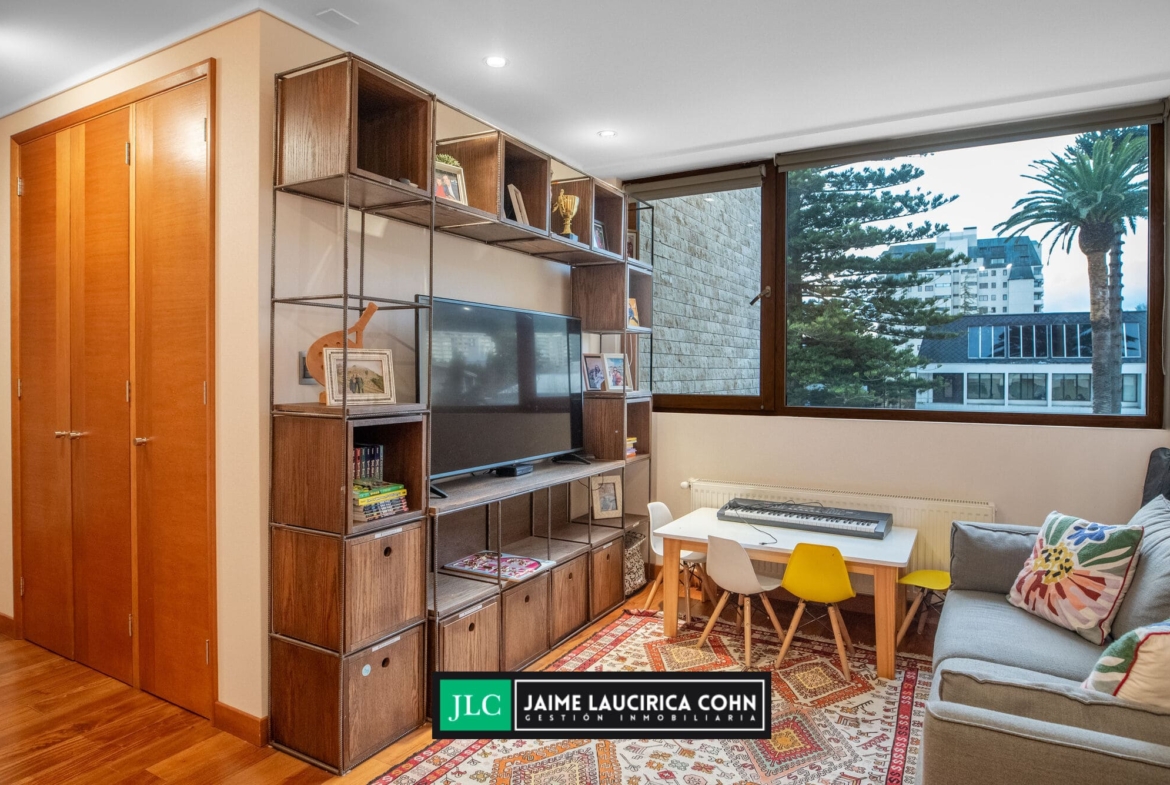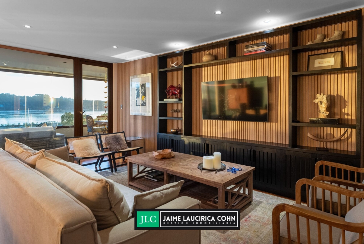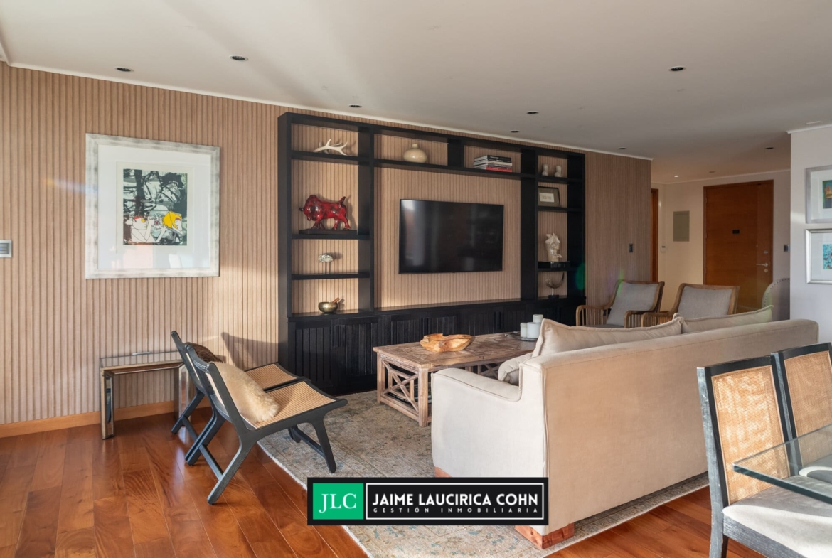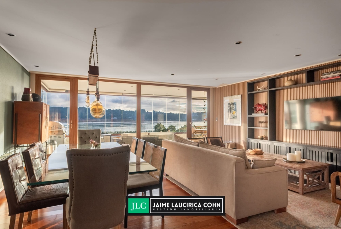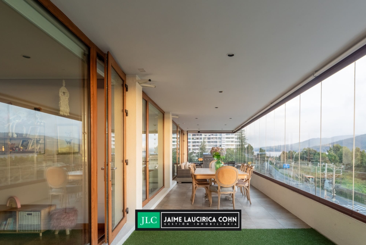 Recibidor privado, hall de acceso, amplio living comedor, con salida a terraza de 60 mts2, cerrada con cristales pegables, insuperable vista y cortinas automáticas.