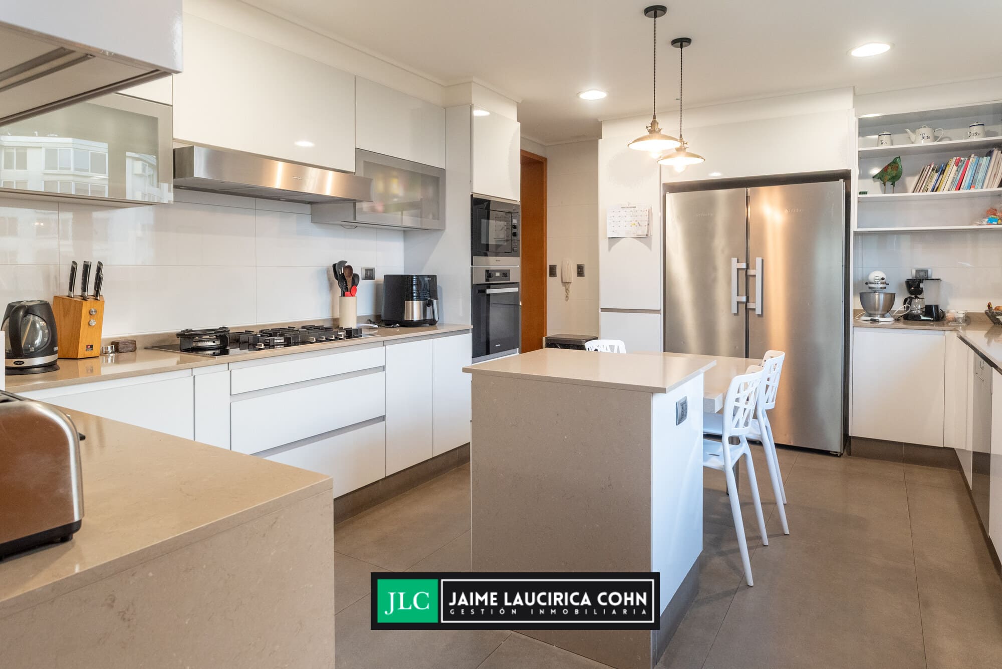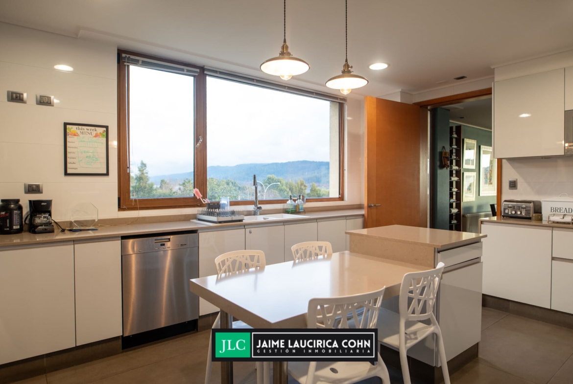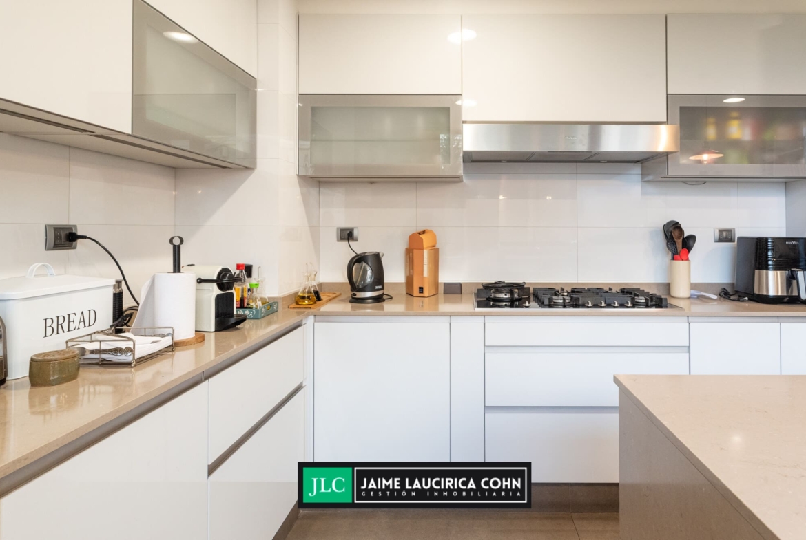 Cocina completamente equipada, microondas empotrado, horno, campana, lavavajillas, cocina de 5 quemadores, muy soleada.