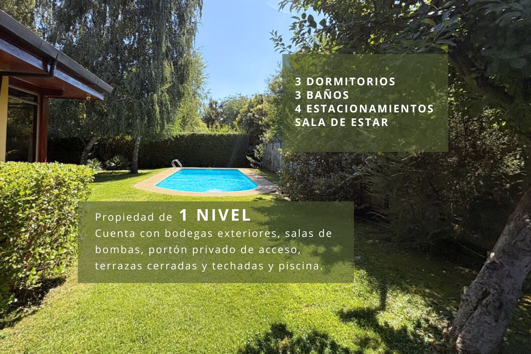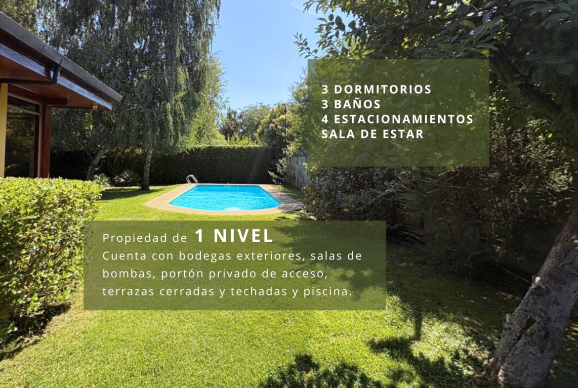 Sector seguro y de alta plusvalía, entorno privilegiado rodeado de naturaleza, lindo jardín formado con palmeras y árboles nativos. Perímetros de la propiedad cerrados con panderetas y cerco vivo. Riego automático, 3 bombas independientes para riego, agua y piscina.